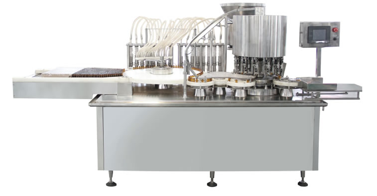 該(gāi)線采用觸摸屏動態顯示操作,PLC程序控(kòng)製;主機變頻(pín)調速。瓶子先經超(chāo)聲波粗洗,後由特製瓶鬥傳輸(shū),經過九組工位內外壓力衝(chōng)洗後,進入高溫隧道烘箱內滅菌、然後轉入灌封機,由漸進式攔邊網帶(dài)進瓶、陶瓷泵跟蹤灌(guàn)裝、柔性單刀或三刀滾壓(yā)跟蹤(zōng)軋蓋、凸輪式收瓶裝置等先進工(gōng)序,自動化程度高。是口服液高產量(liàng)新型的理想設備(bèi)。